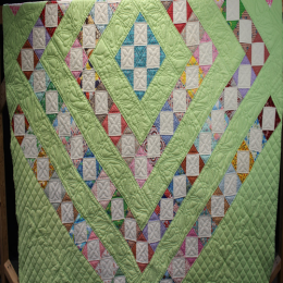 This quilt was made Irene Ellermeier of Bruning, NE in 1990. Irene was my grandmother and passed away in 2000. She loved bright colors and was very resourceful in using even the smallest scraps of fabric.