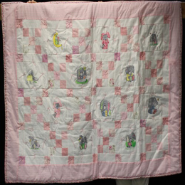 Blocks were purchased at a sale with machine embroidered bunnies. Pastor Marsha Jark-Swain put together the top. It was tied by Marsha and Sharon Viergutz. Sharon bound the quilt.